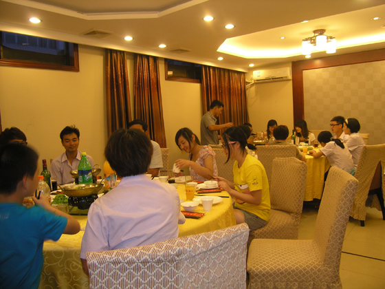 歡樂的時光總是走的特別快,不知不覺中已是夕陽西下了,戀戀不舍的我們離開了充滿無限魅力的碧海金沙,前往下一個目的地——洪廟大酒店。當(dāng)我們抵達(dá)酒店的時候,公司已經(jīng)為我們準(zhǔn)備好了滿滿幾桌的美酒佳肴。疲憊不堪的我們難以抵制美食的誘惑,很快就狼吞虎咽的吃起來了。美酒、佳肴、夜光杯,還有什么能比此時的我們更幸福呢?